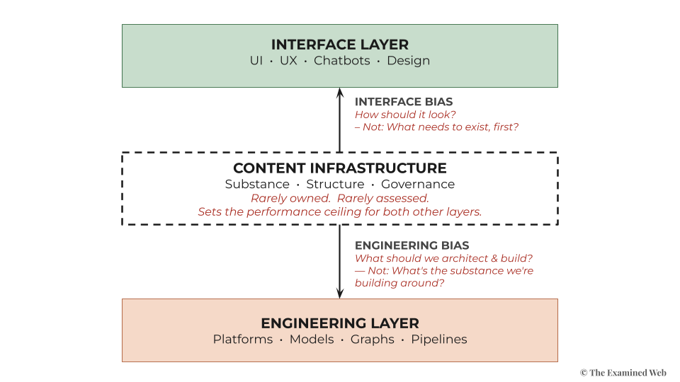 Two inherited biases from the web era explain why content infrastructure stays invisible in transformation planning.