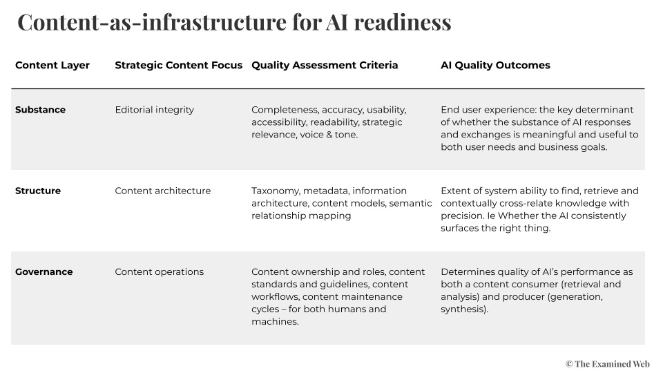 When content is treated as infrastructure, a different assessment framework emerges. Content-as-infrastructure has three interdependent layers: