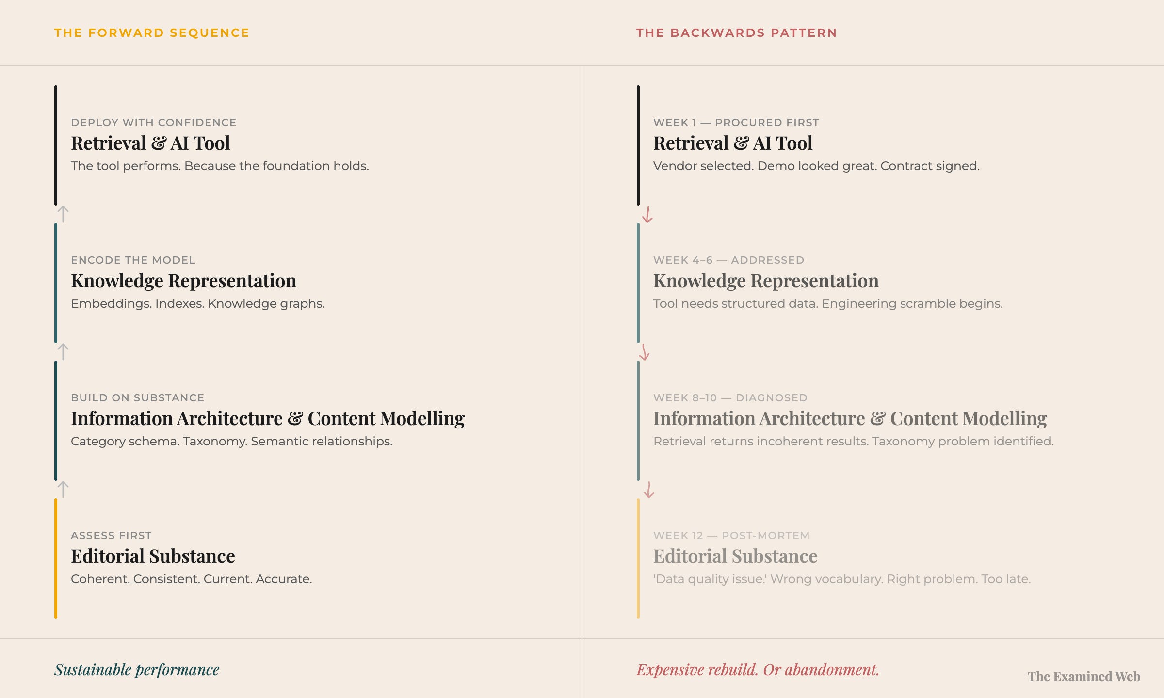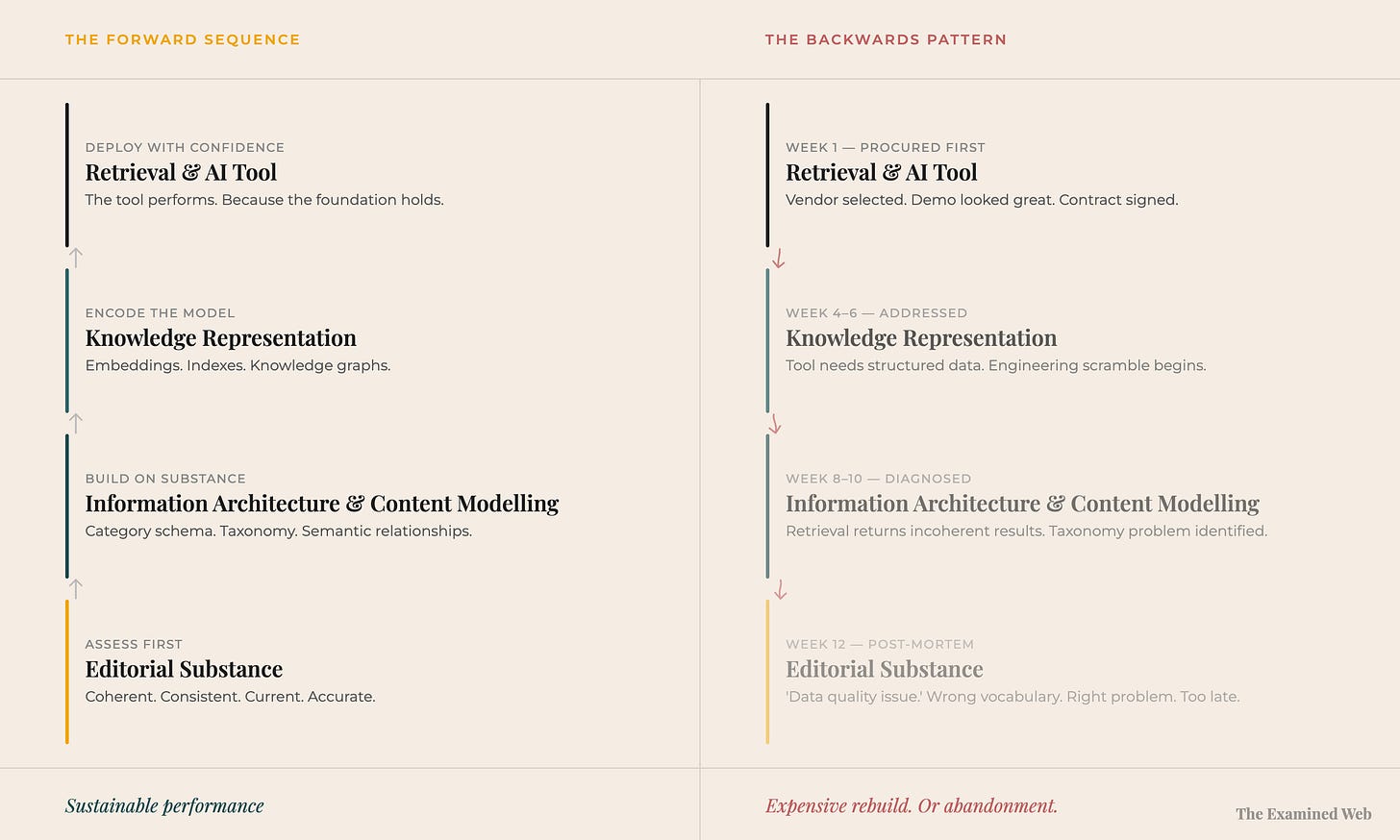 Retrieval cannot outperform the knowledge representation feeding it. Knowledge representation cannot impose structure on content that has none. Content modelling cannot organise material that is incoherent at the substance level.